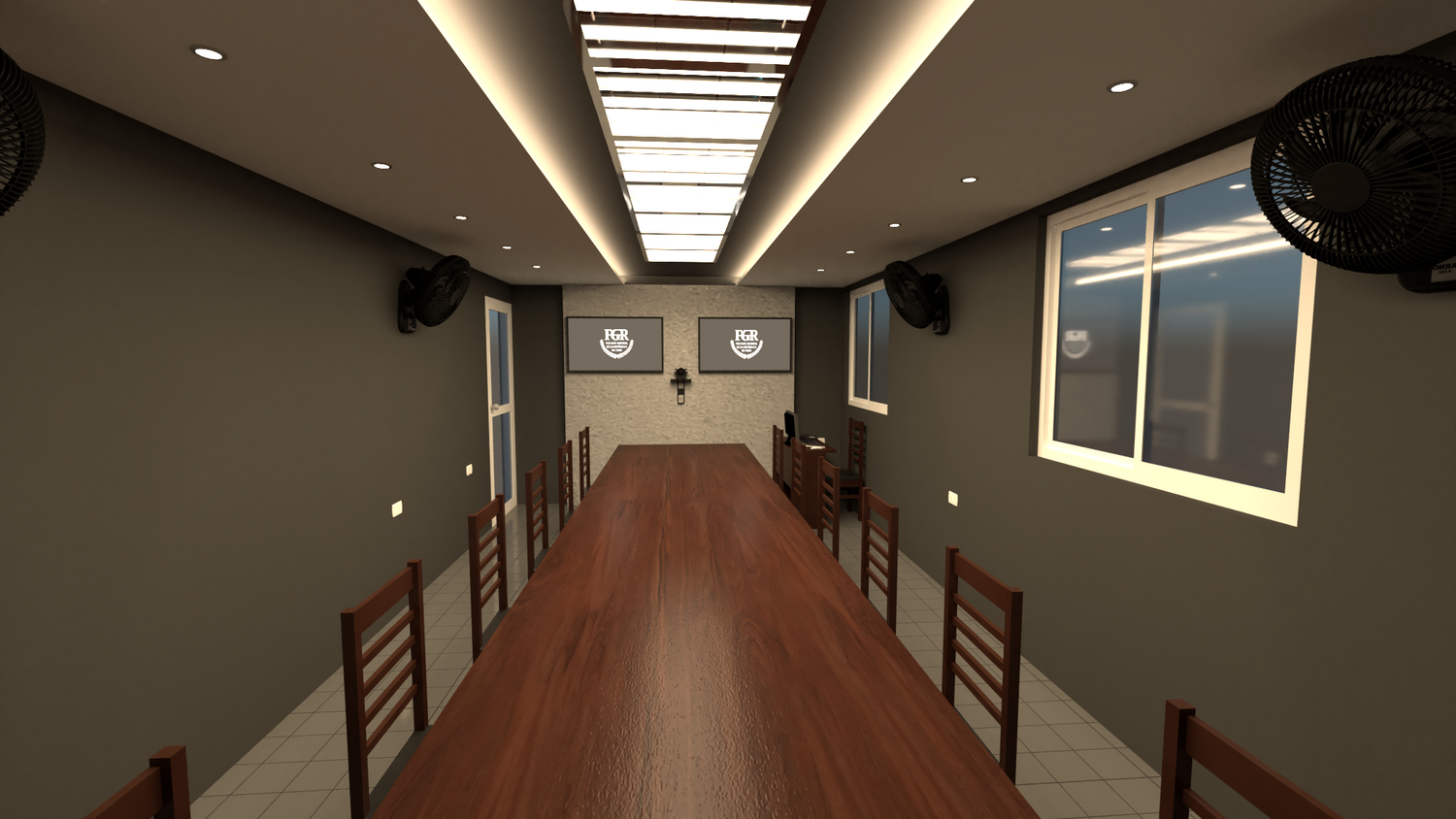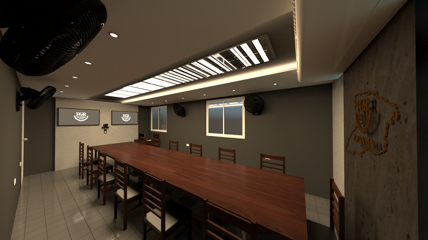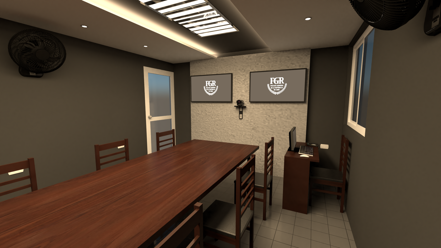 The project consists of adapting an existing meeting room into a videoconference room for the FGR. A simple design was sought, without points of emphasis that captured the attention of the participants. The colors evoke the sober character of the judicial institution. For the spatial design of the furniture and technical equipment, the document issued by the company Solintel, S.A. that establishes the parameters to be considered for better results was taken as a reference.