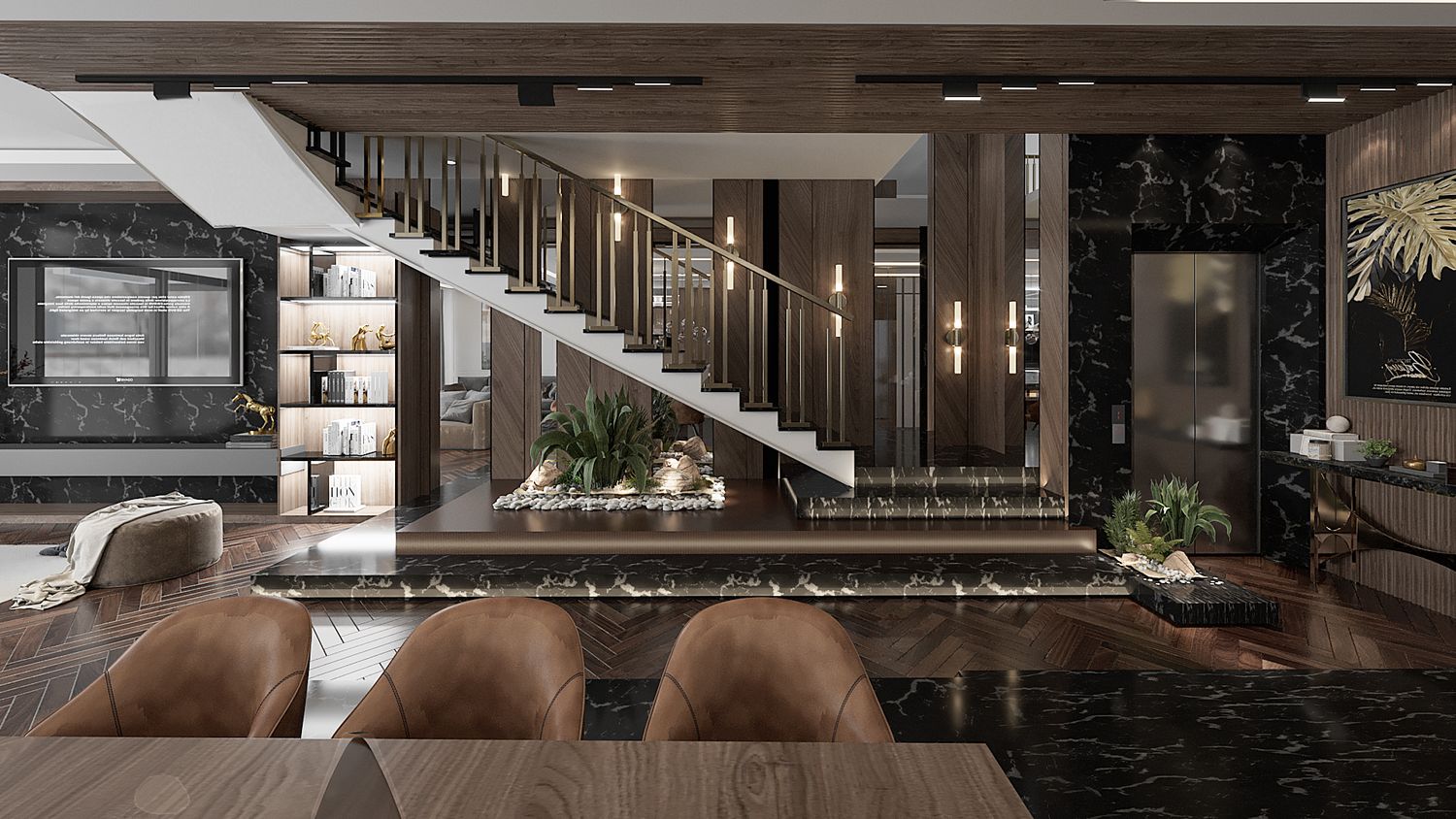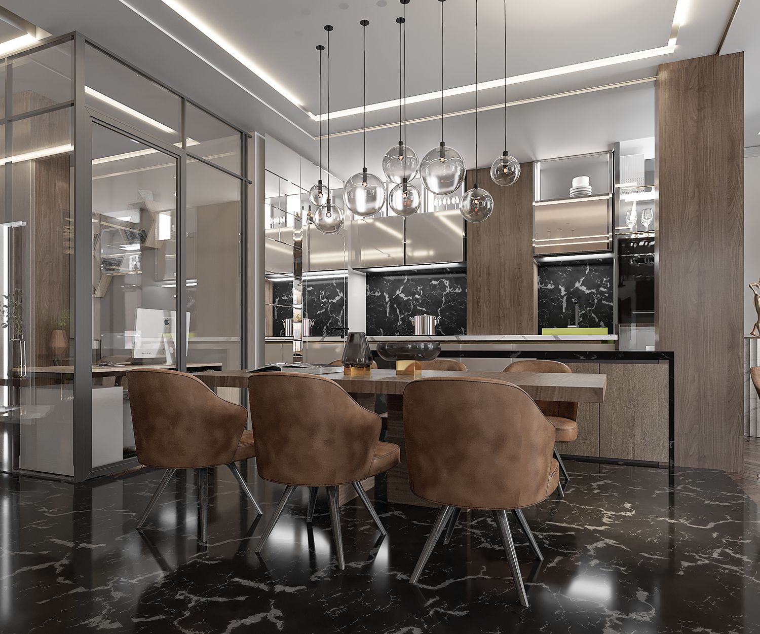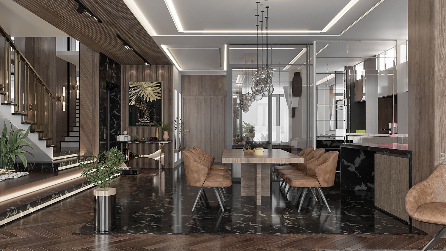 interior design for a luxury modern villa living area with an open kitchen and dining space