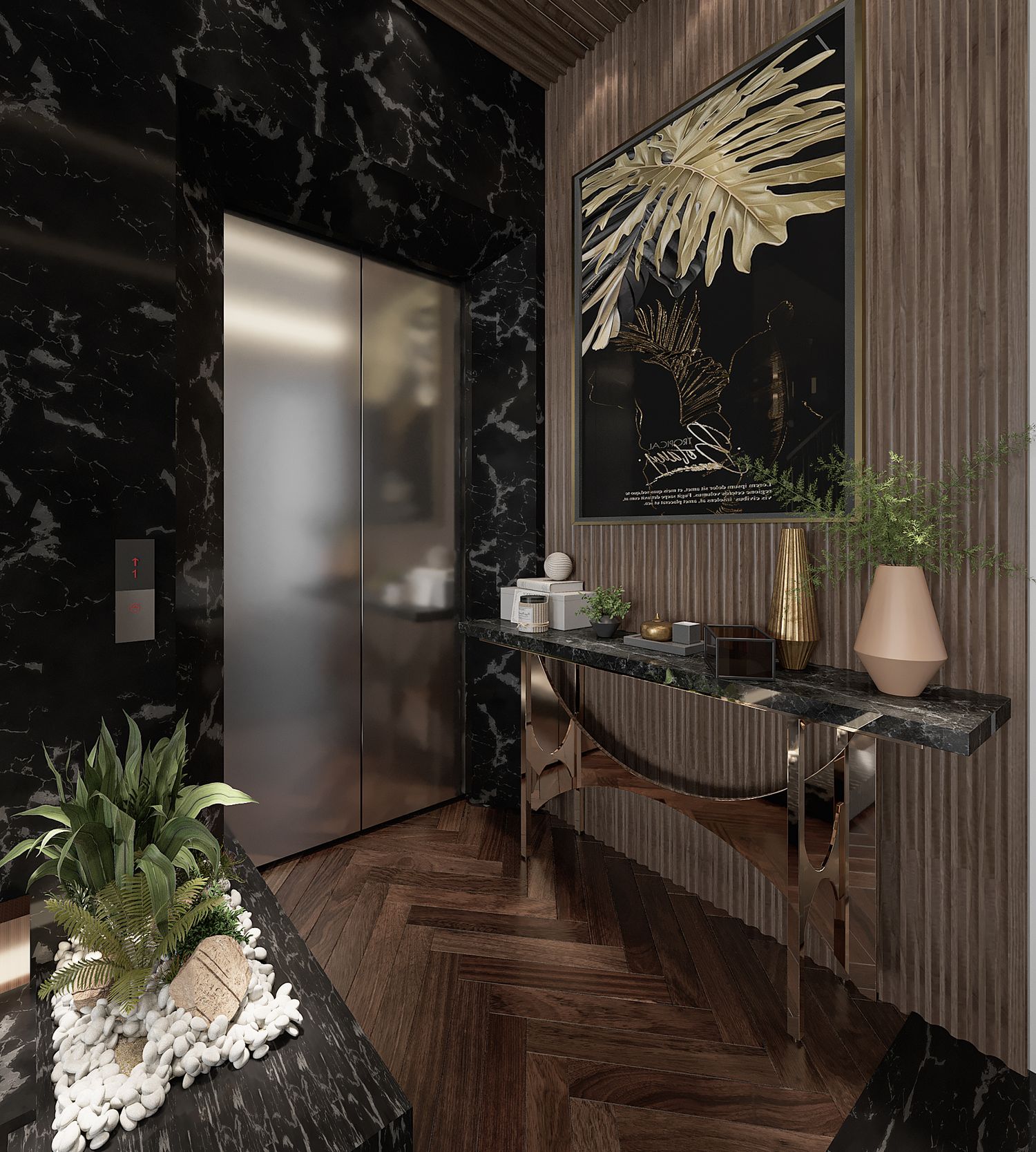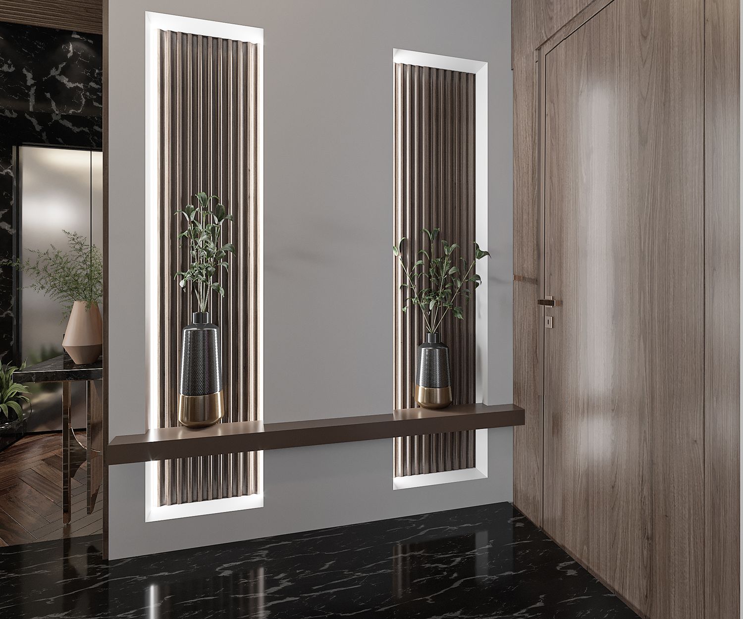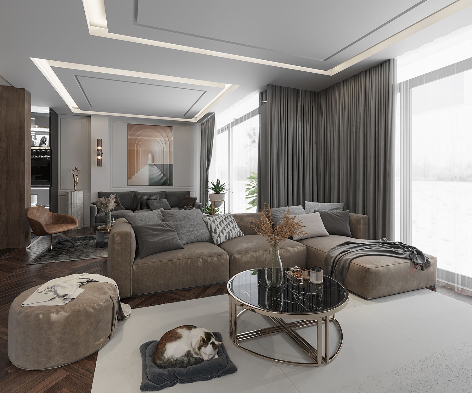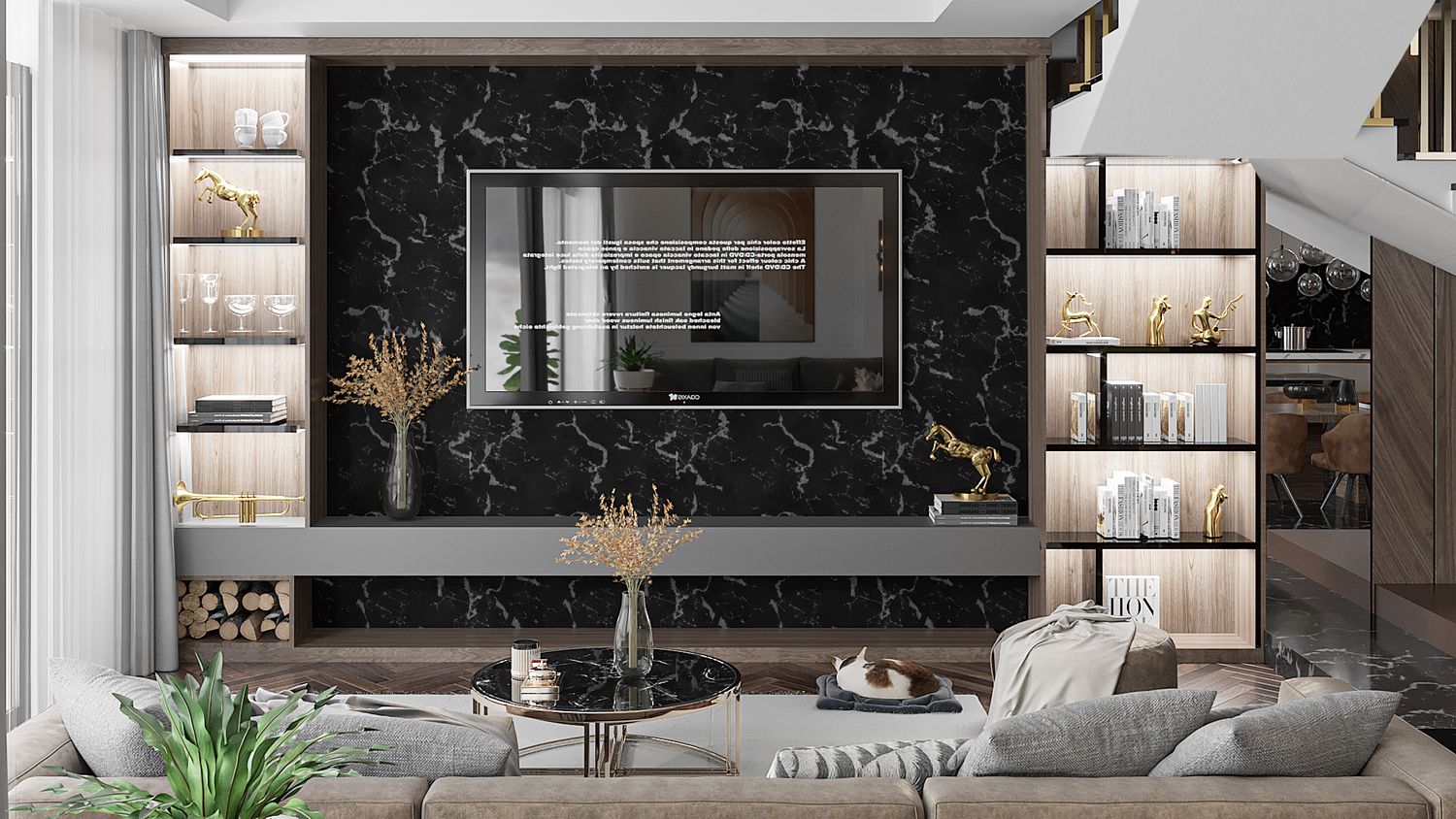 interior design for a luxury modern villa living area with an open kitchen and dining space
