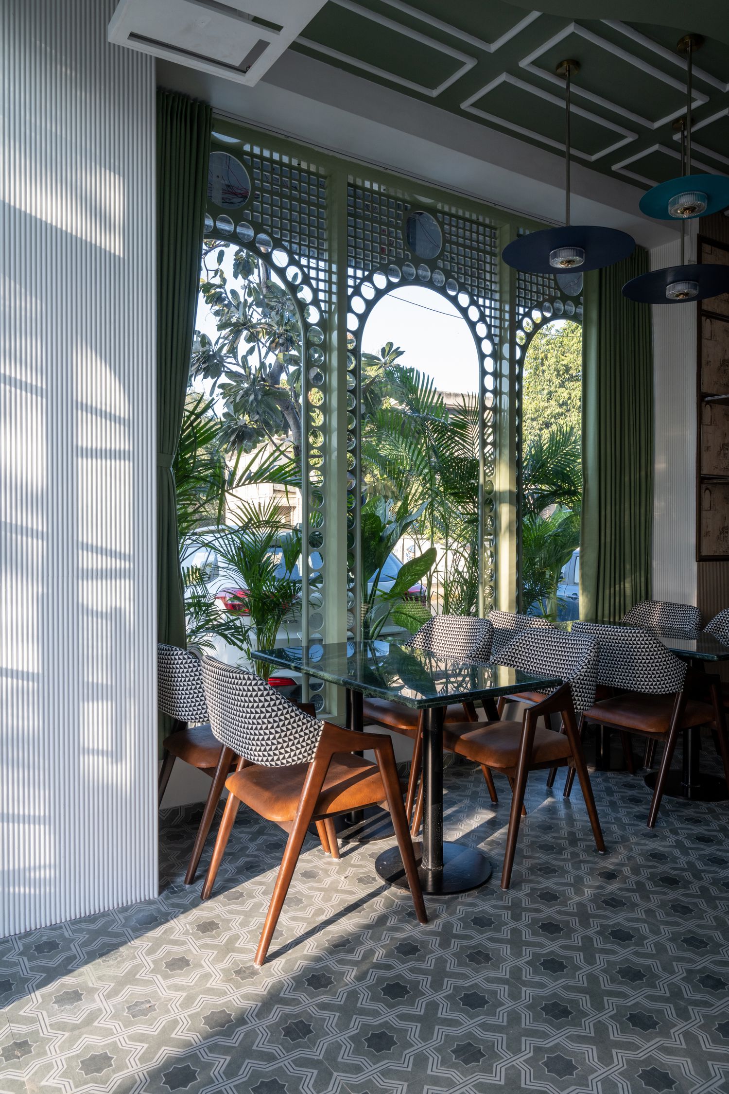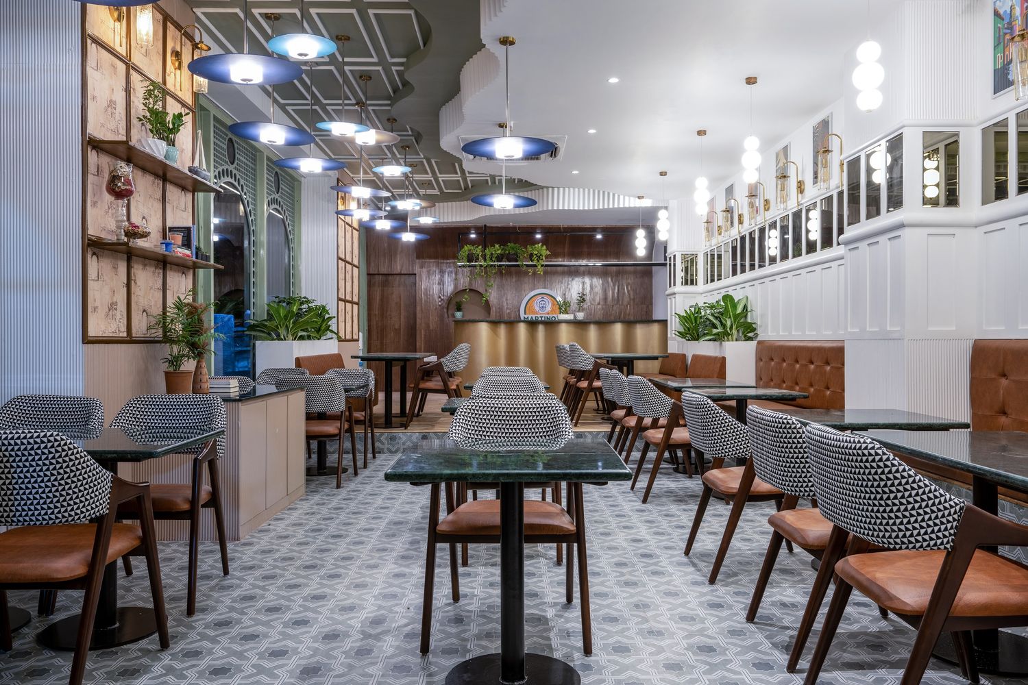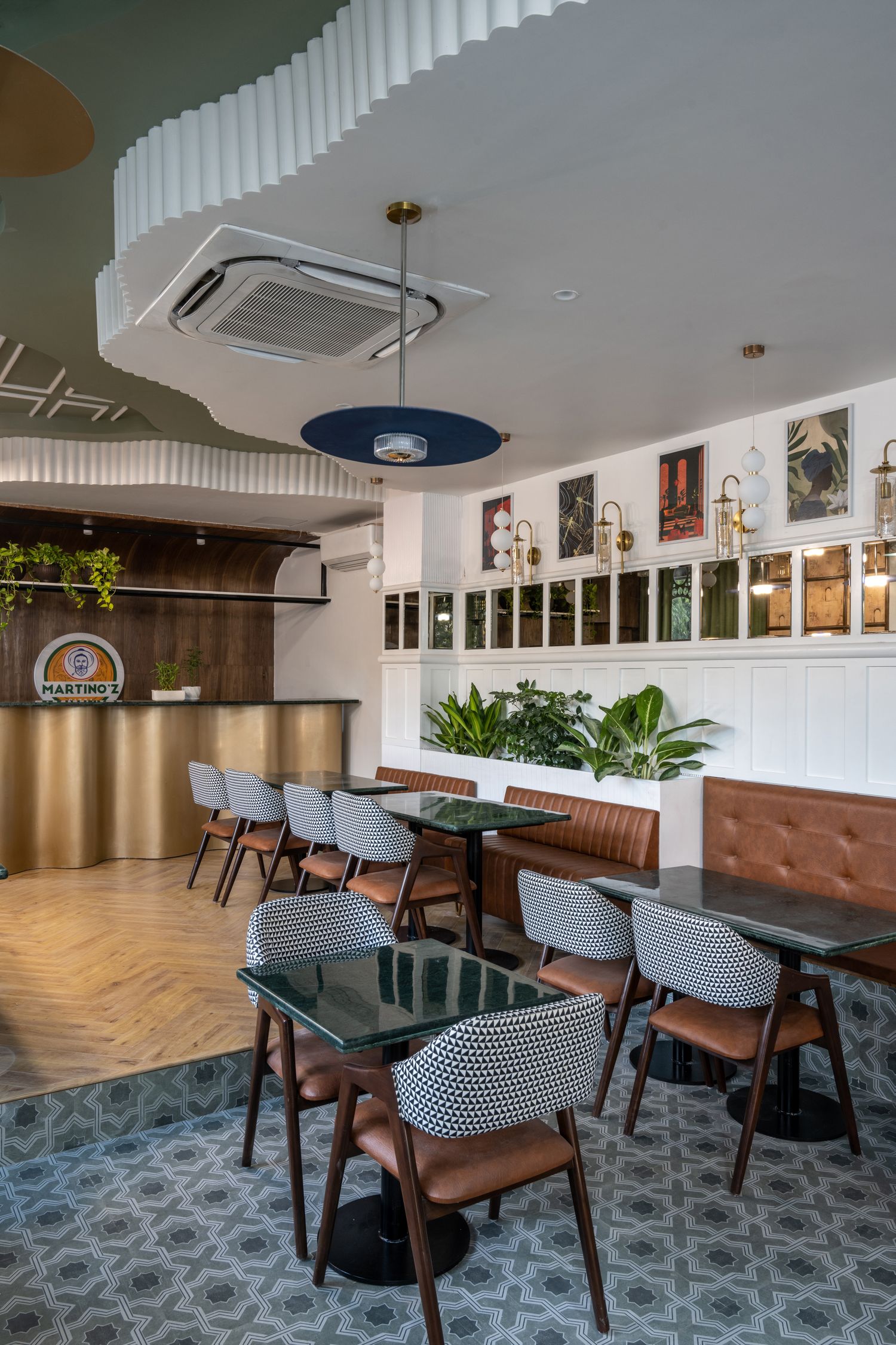 Pizzeria cum restaurant that not only has customized ceilings , lights , flooring but also offers great street views. we incorporated some greens in the space .