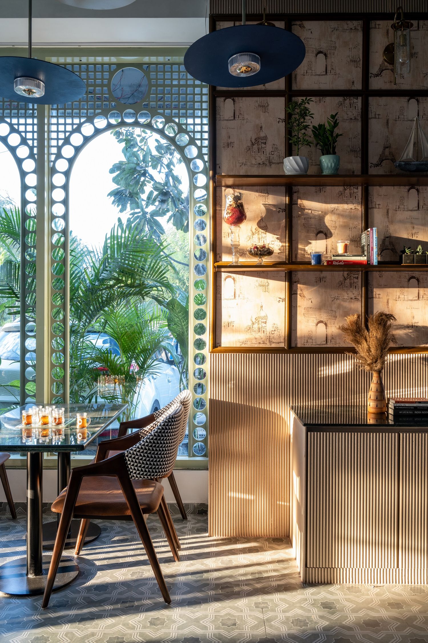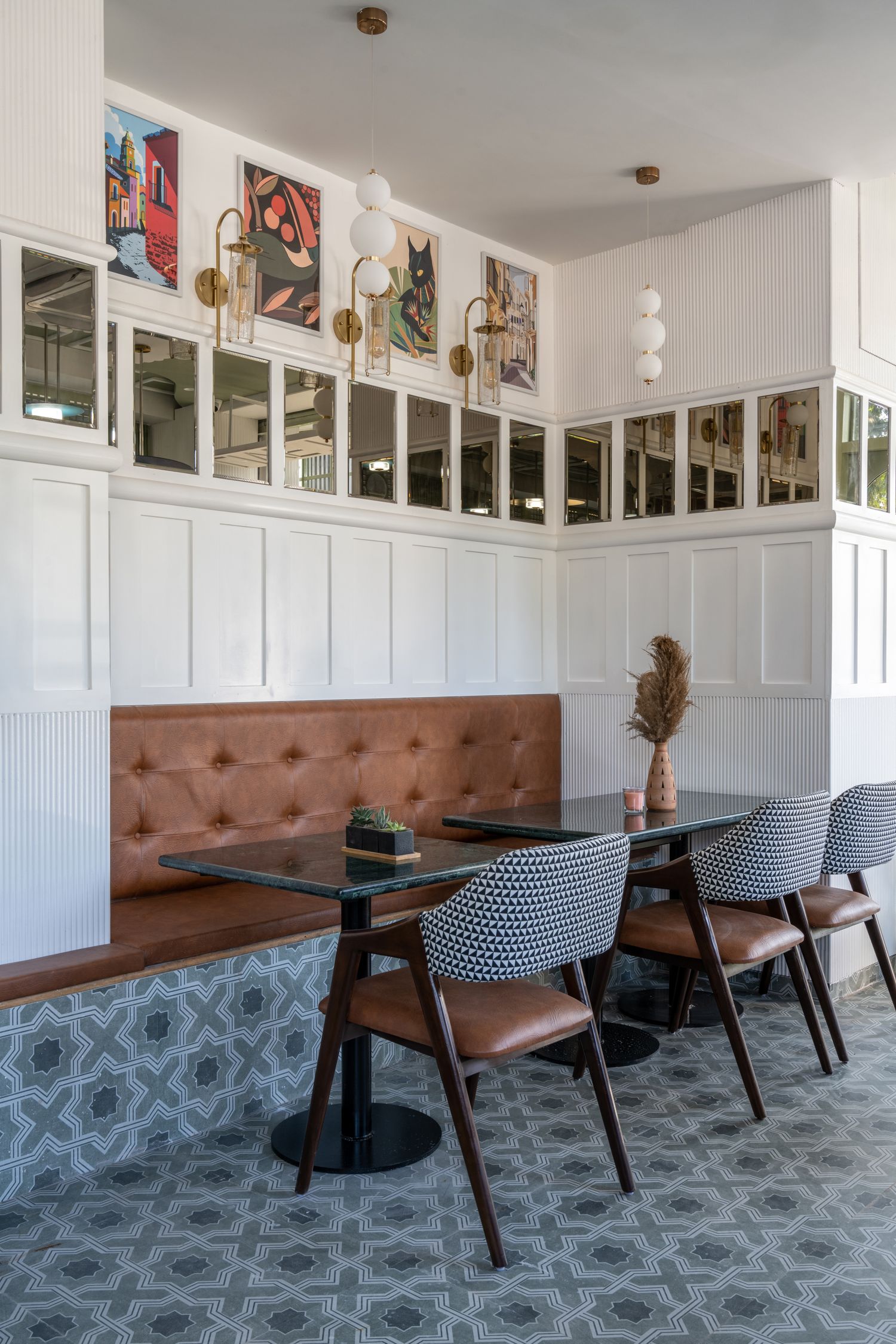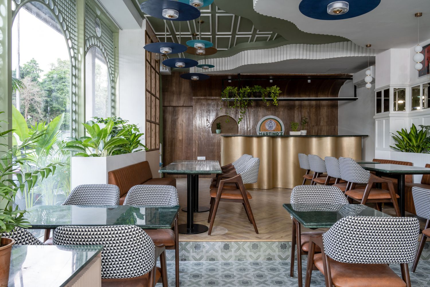 Pizzeria cum restaurant that not only has customized ceilings , lights , flooring but also offers great street views. we incorporated some greens in the space .