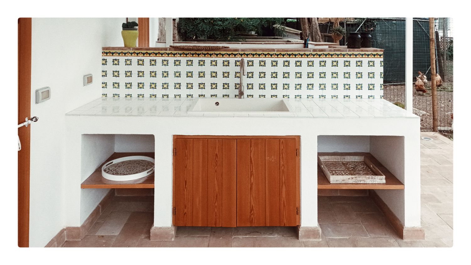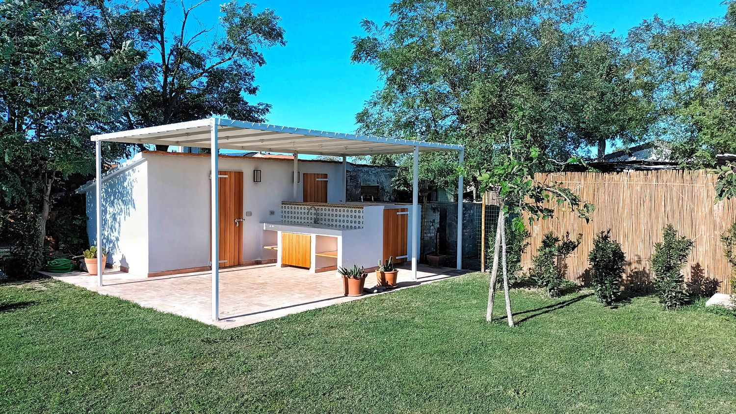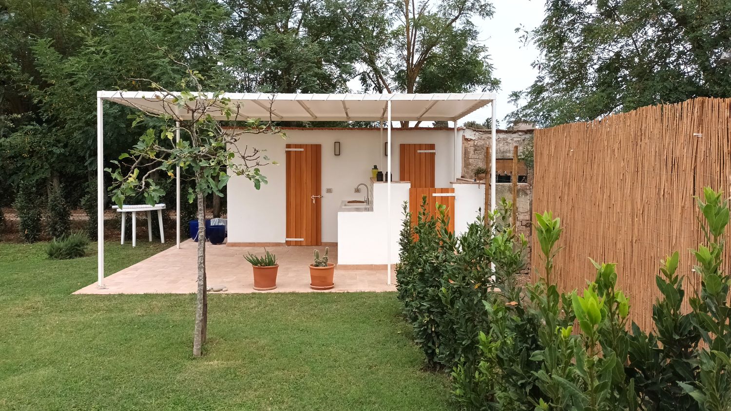Il magazzino agricolo risultava ormai privo della funziona originaria e pericolante. I due ambienti interni sono stati trasformati in cucina e piccolo bagno, mentre l'esterno è stato pavimentato e arricchito di una pergola bianca molto leggera per poter godersi a pieno la suggestiva atmosfera dello spazio esterno.