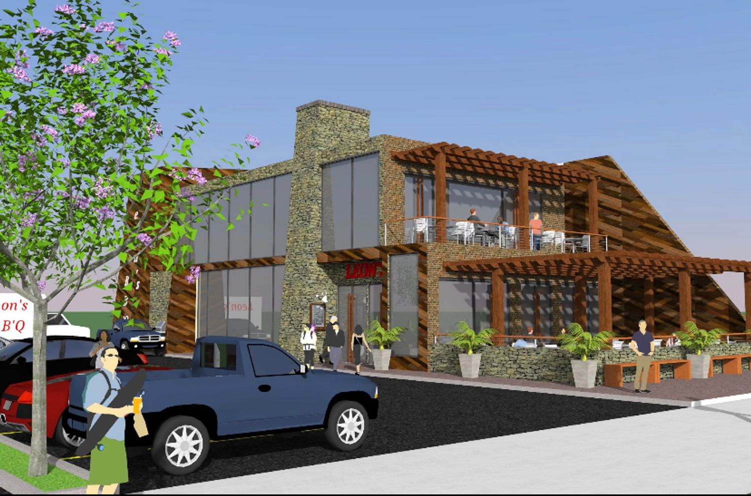 This was an existing store front restaurant that only catered to walk-in orders, the entire building was not being utilized to it's fullest potential. So the client wanted to expand to create an in-dining experience with outside seating a place for live entertainment and drive thru-ordering; See existing lot and building below along with proposed design.