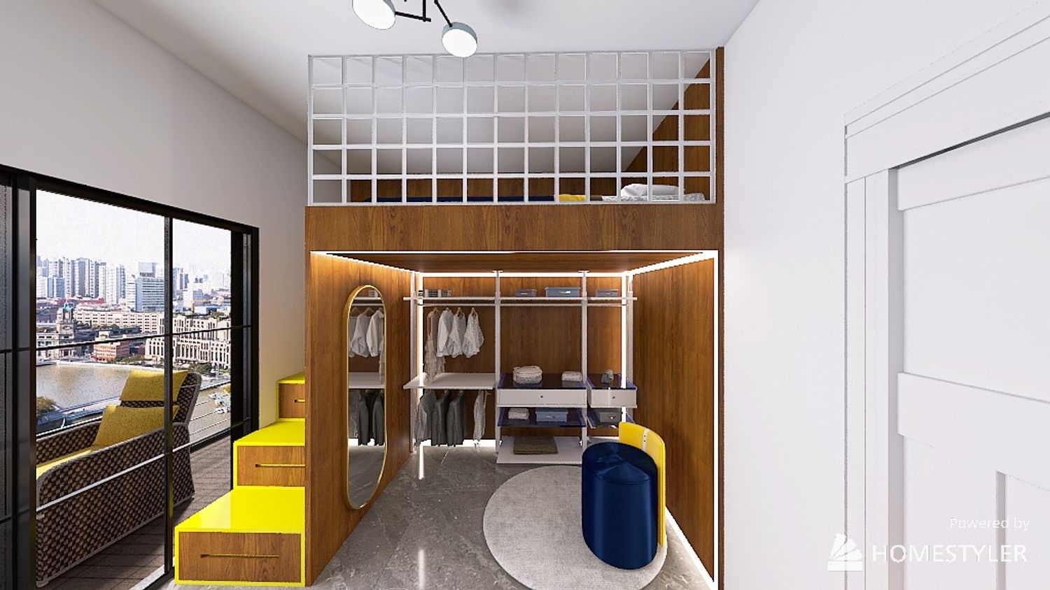 Il letto è una delle parti più confortevoli e accoglienti della stanza. È arredato con coperte blu scuro ,bianche e giallo ed è collocato su un soppalco reso sicuro dall’installazione di una rete da pallovale .Al di sotto è collocata la cabina armadio a vista realizzata in metallo bianco e dettagli in vetro blu .