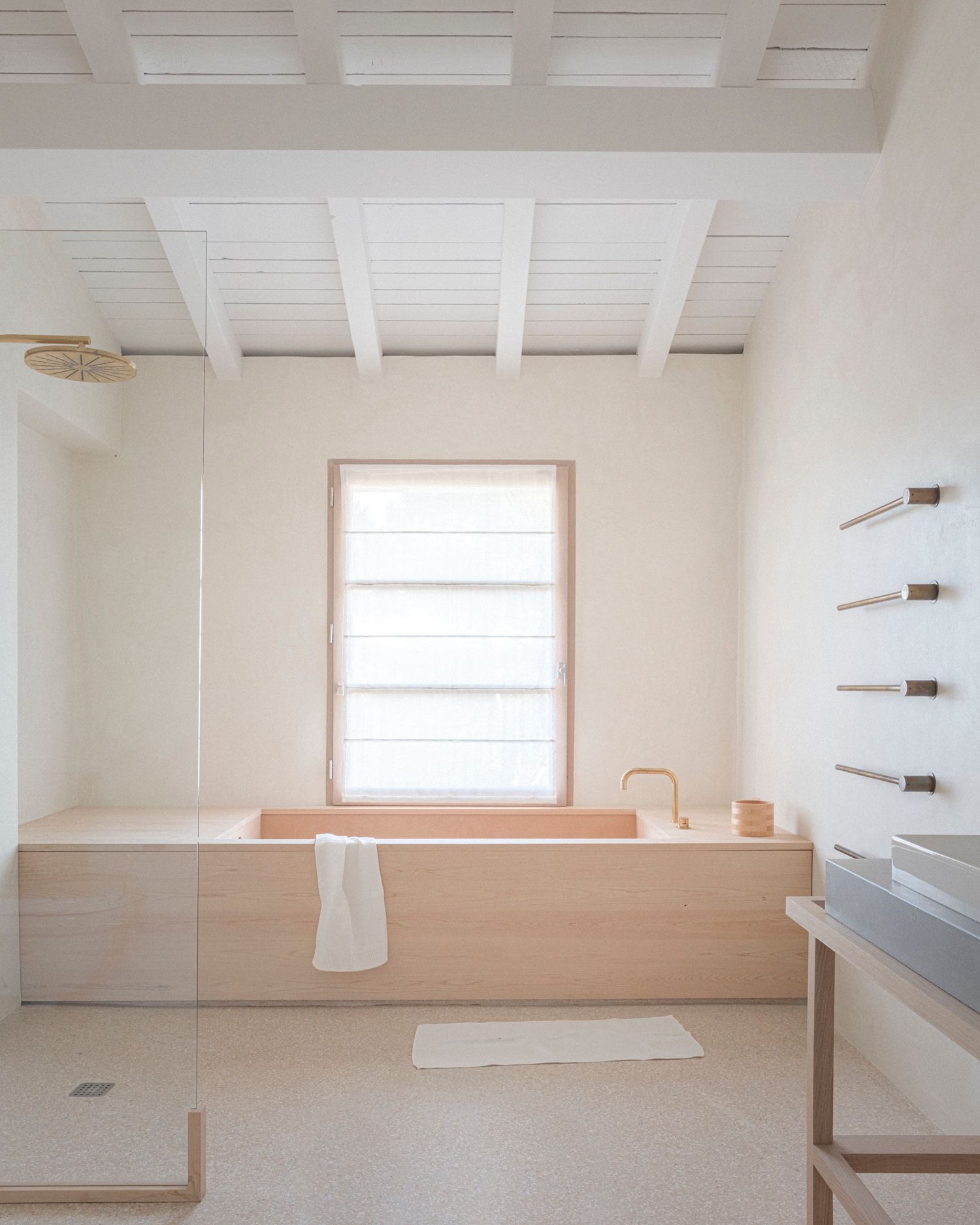 The existing structure was carefully dismembered in phases. The footprint and envelope were revised but stayed very much in keeping with the proportions of the old farmhouse. More than a simple reconstruction, this house was imagined as a renewal, emphasizing the house’s quirks and lending voice to careful craftsmanship. We took cues from surrounding architecture and amplified them. Most walls are finished with “chaux”, a local lime plaster that leaves the surface textured and uneven. The casework was drawn plainly and is almost entirely carved from regionally sourced oak. The tiles on the roof are “tuiles anciennes”, some more than 30 years old, ranging in color from green to red.