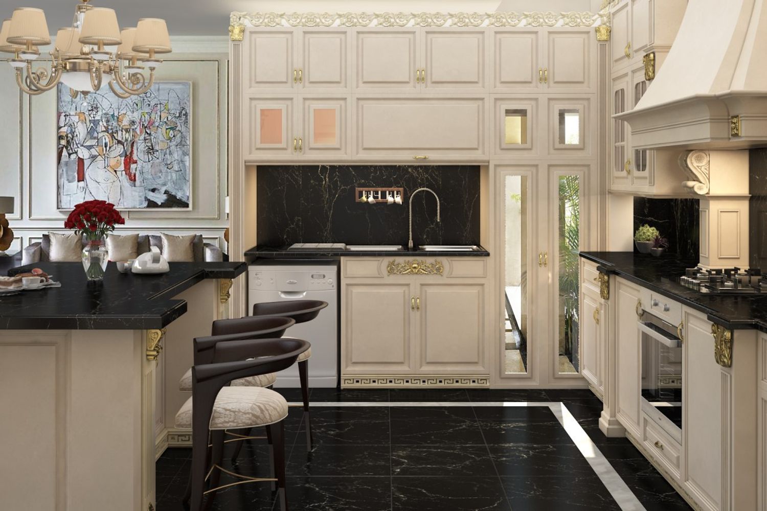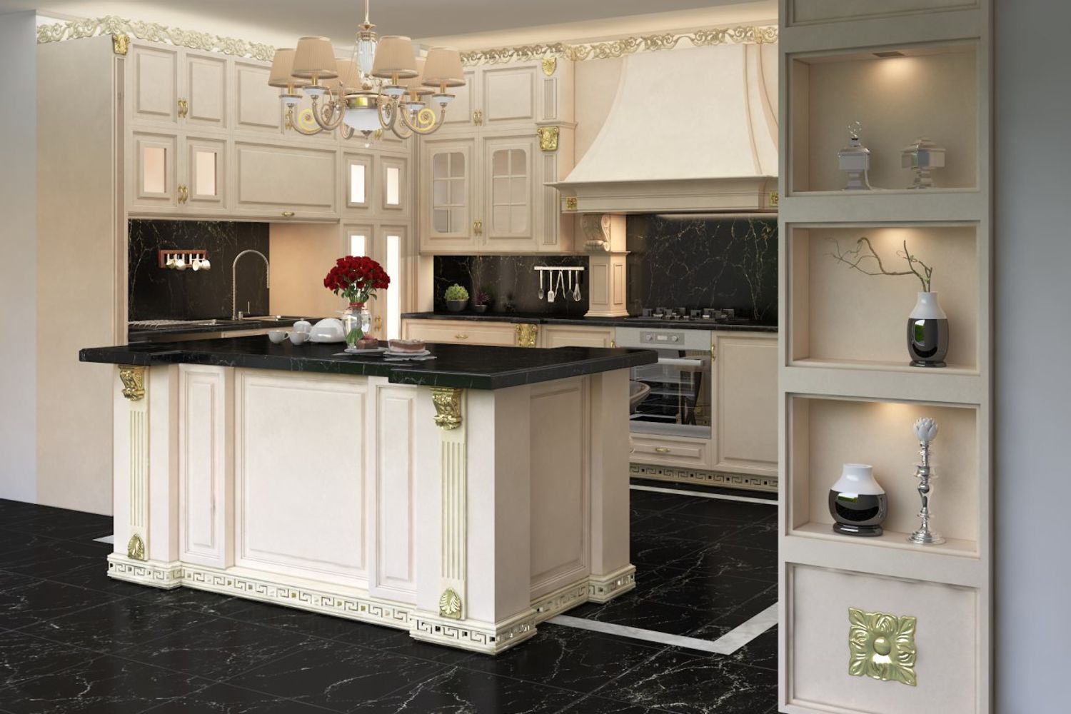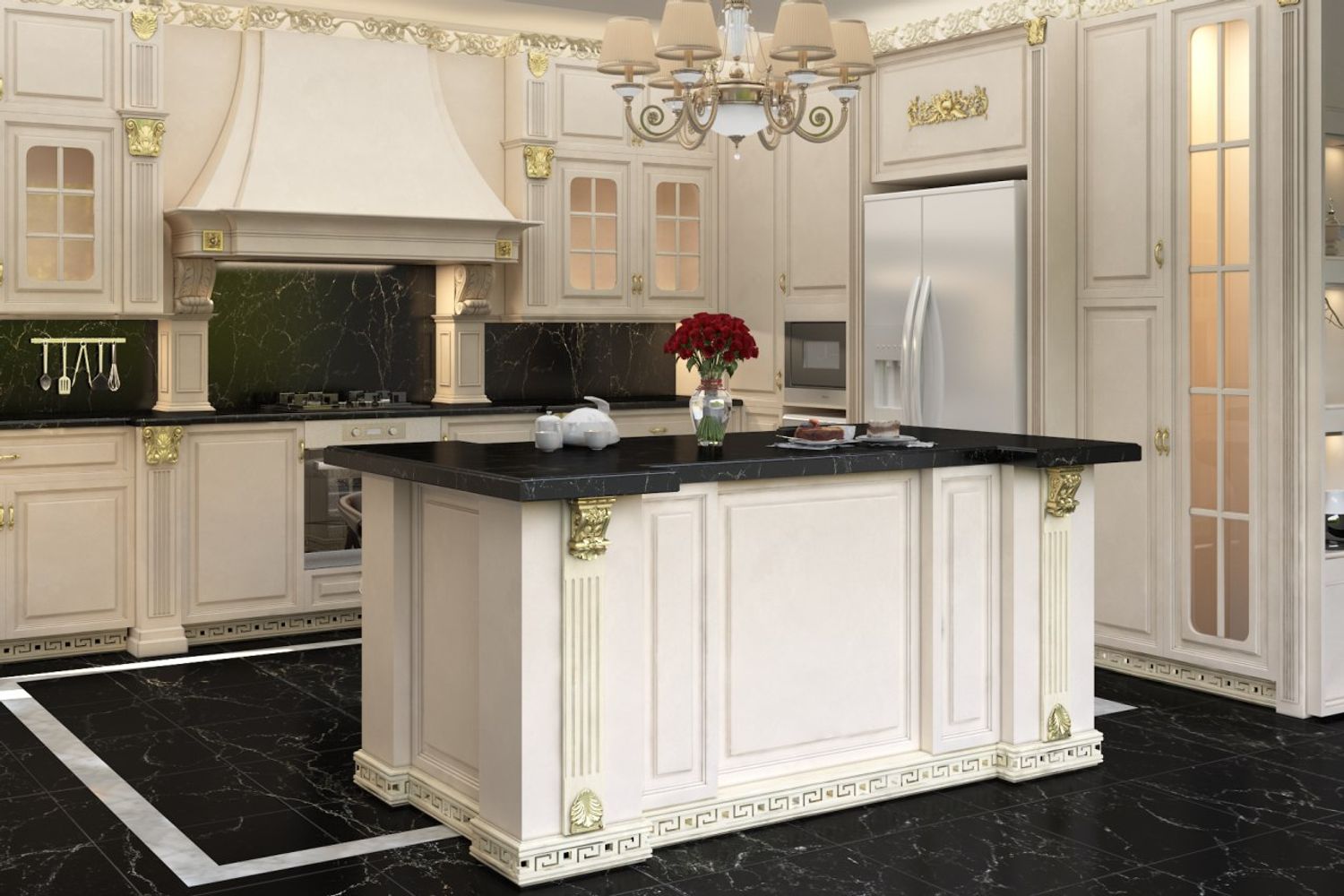 This kitchen favour natural materials, panelled cabinet fronts, a soft palette with off-white, black and cream, detailed corbels and moulding, decorative lights and Custom range hood.