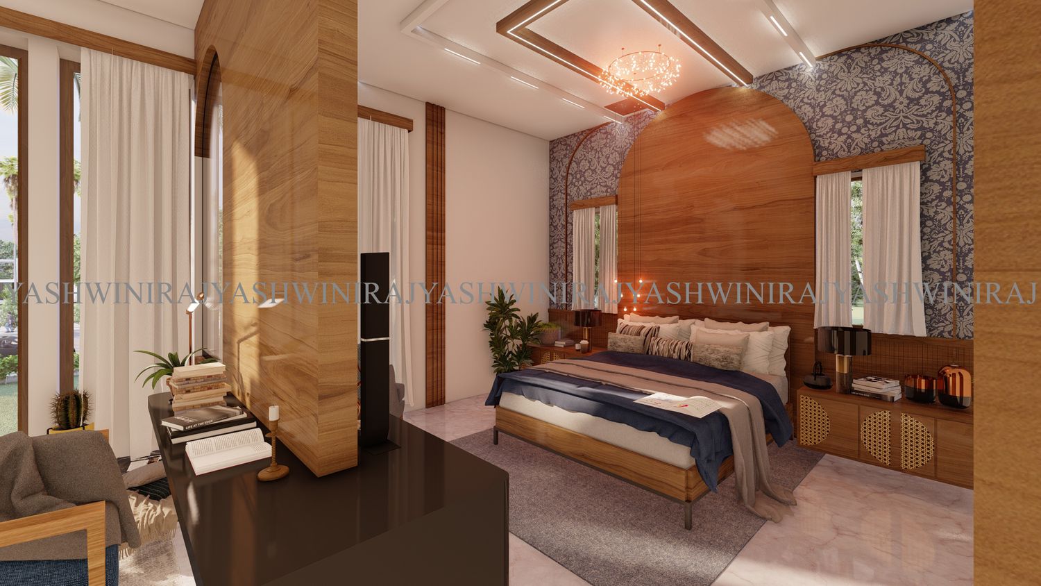 View of TV unit, workspace with French window from the master bedroom on the first floor.