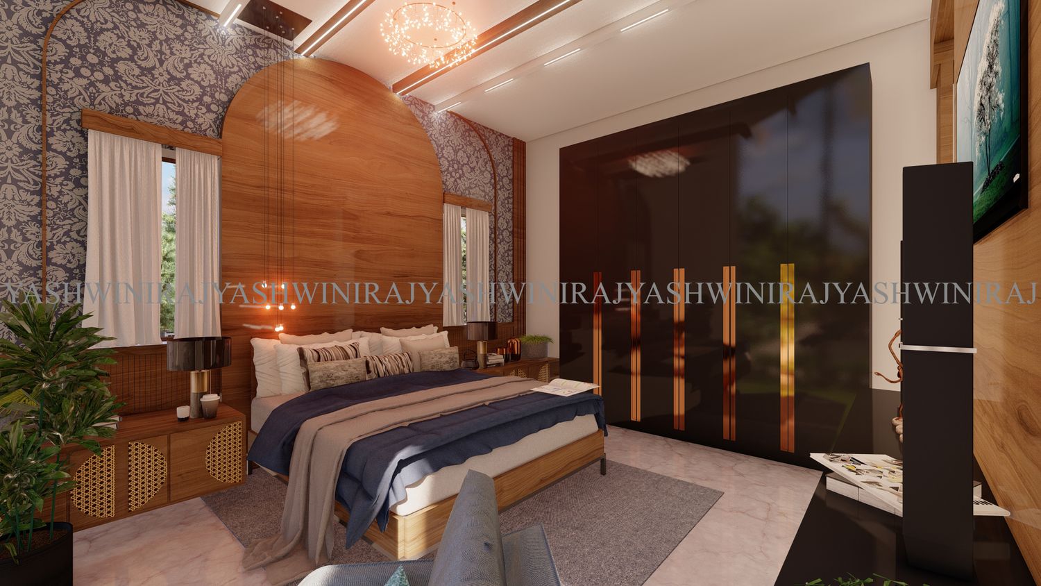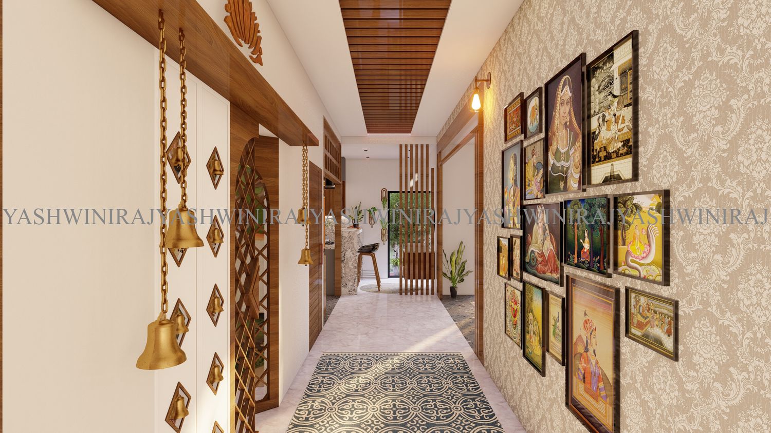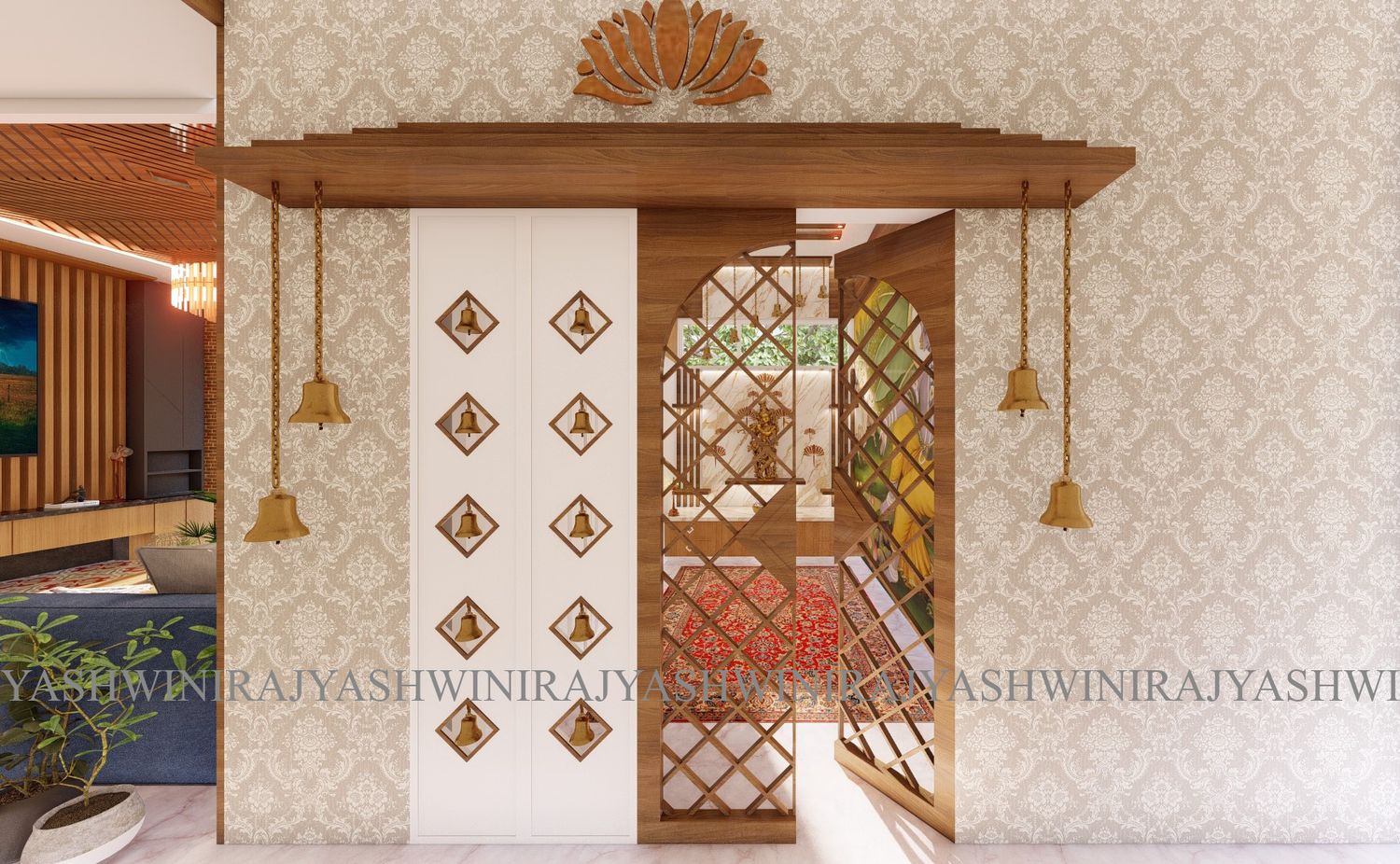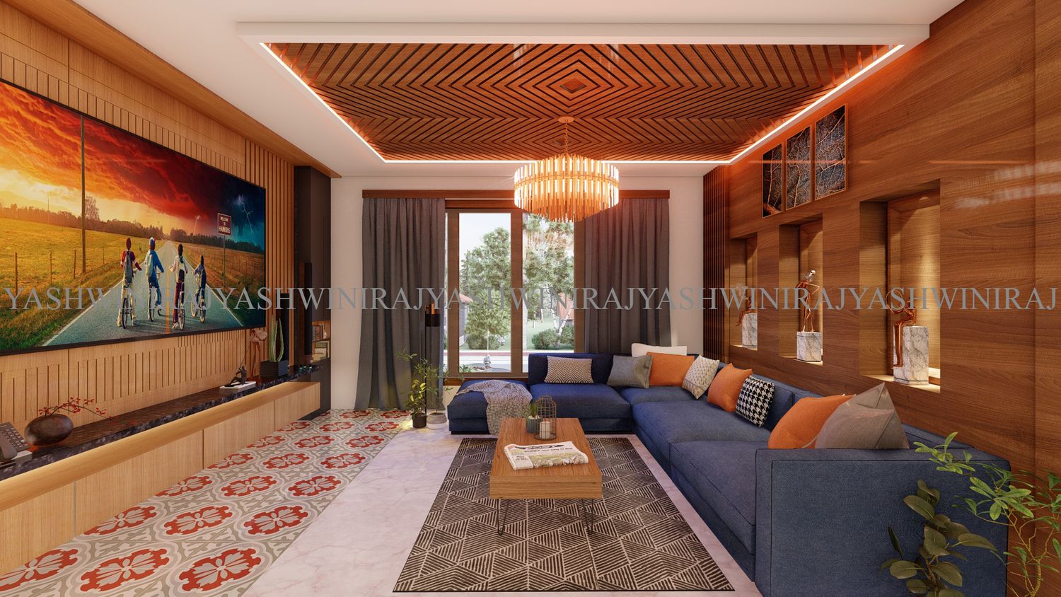 The living room in the front is bright and spacious with natural lights falling from the well-planned French window and the wood texture behind the tv unit is adding visual impression.