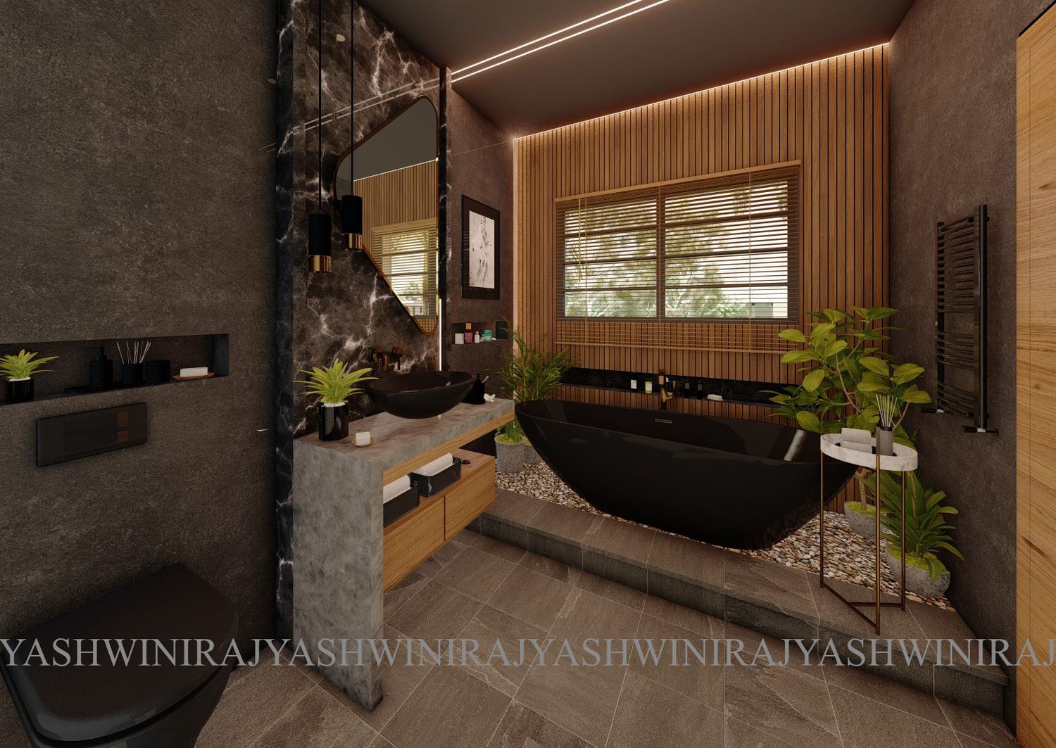 The bathroom of the master bedroom has shades of grey in the form of tiles and granite.